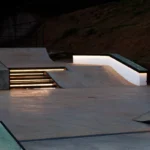 Toda essa geometria complexa foi executada com um acabamento de concreto polido de altíssima qualidade, com a incorporação de aditivos plastificantes, endurecedores de piso e agentes de cura química. Essa combinação garante uma superfície lisa e resistente, aumentando a qualidade e a durabilidade do equipamento. Além disso, foi implementada uma drenagem inteligente, projetada para escoar a água da chuva e prolongar a vida útil do material.