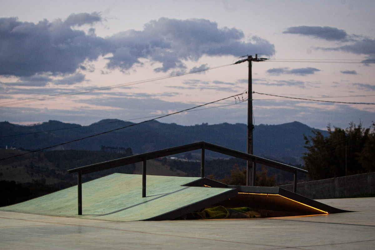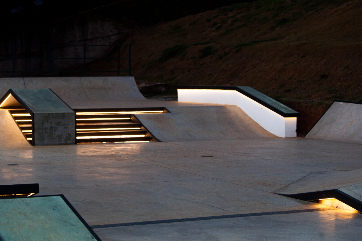 Toda essa geometria complexa foi executada com um acabamento de concreto polido de altíssima qualidade, com a incorporação de aditivos plastificantes, endurecedores de piso e agentes de cura química. Essa combinação garante uma superfície lisa e resistente, aumentando a qualidade e a durabilidade do equipamento. Além disso, foi implementada uma drenagem inteligente, projetada para escoar a água da chuva e prolongar a vida útil do material.